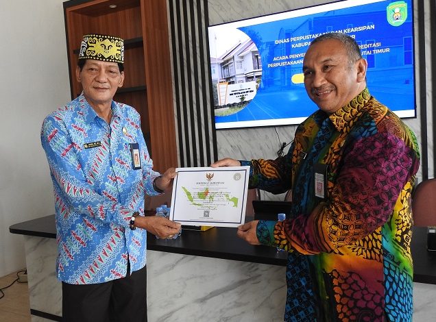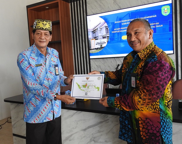 Usai penyerahan, Kadis DPK Kaltim Syafranuddin mengatakan hari ini kami menyerahkan sertifikat akreditas bagi Dinas Perpustakaan dan Kearsipan Kutai Timur.